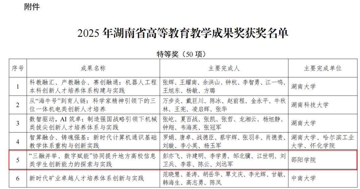 近日,湖南省教育厅公布了2025年高等教育教学成果奖获奖名单,邵阳学院信息科学与工程学院彭亦飞副教授主持的《“三融并举、数字赋能”协同提升地方高校信息类学生创新能力的探索与实践》成果荣获特等奖。