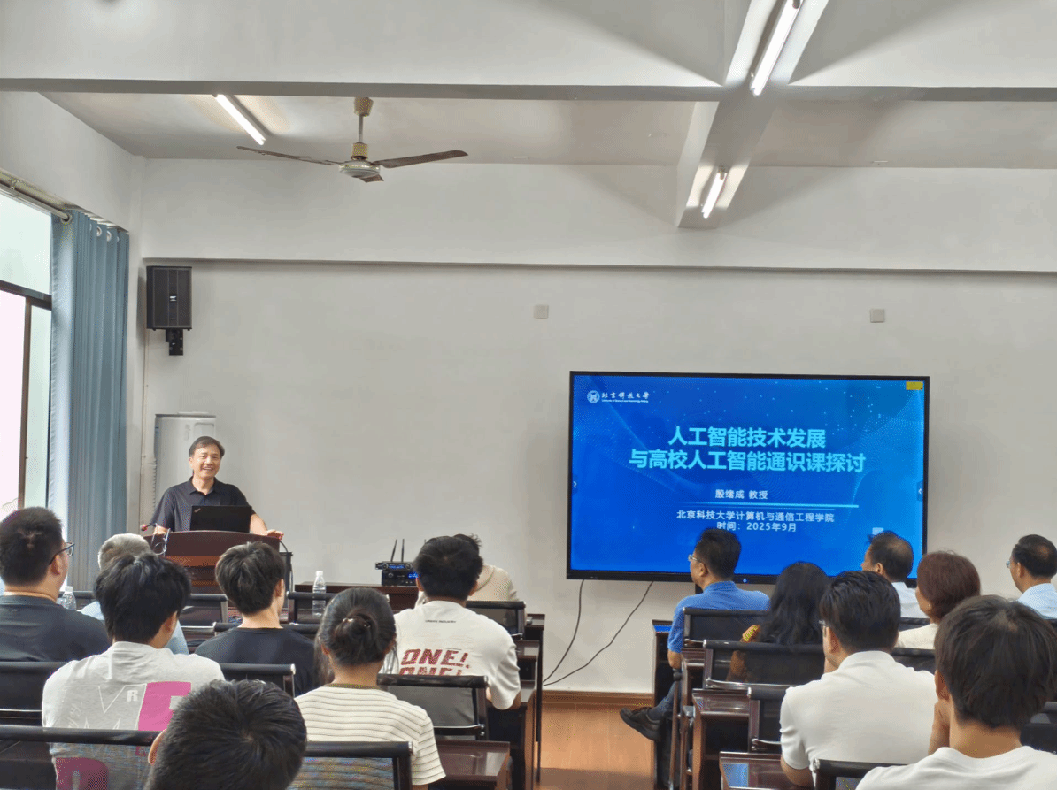 2025年9月30日上午,北京科技大学殷绪成教授应邀到信息科学与工程学院作主题为《人工智能技术发展与高校人工智能通识课探索》的学术报告。报告由学院院长邹北骥主持,学院领导及大学计算机基础教研室全体教师参加了报告会。