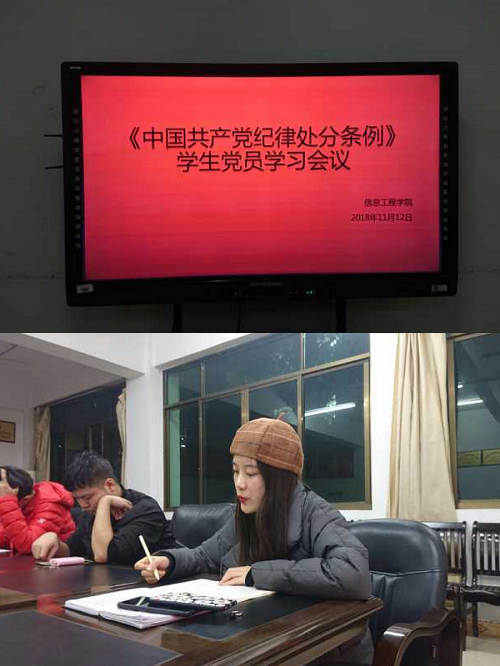 11月13日,信息工程学院于求真楼5328举行了《中国共产党纪律处分条例》学生党员学习会议,本次学习会议由学生第四党支部书记肖童丹老师主持。