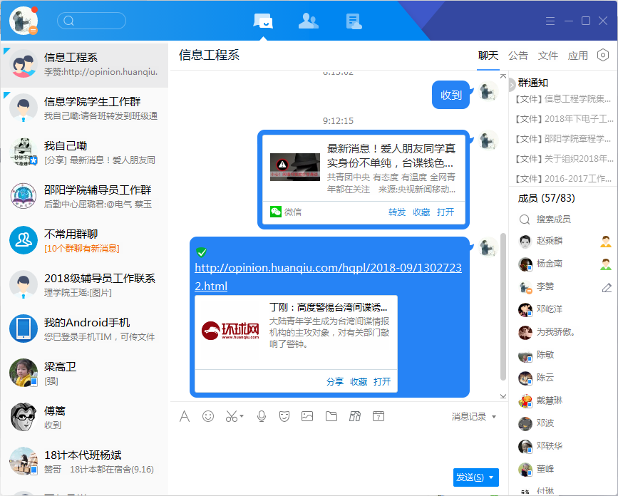 9月16日,环球时报指出:现实中的间谍活动有时不会像影视片中那样惊悚、离奇,但它却悄悄地渗透进了我们平常的生活、学习和工作中,更具隐蔽性,更不容易被察觉。这种看似平凡的间谍活动,往往会有极强的连续性和诱惑力,对个人和家庭的生活,对国家安全的破坏性可能会更大。学院安排专门人员在微信群和QQ群转发了央视网微信公众号及《环球时报》旗下《环球网》的有关报道,组织老师和学生阅读和学习。