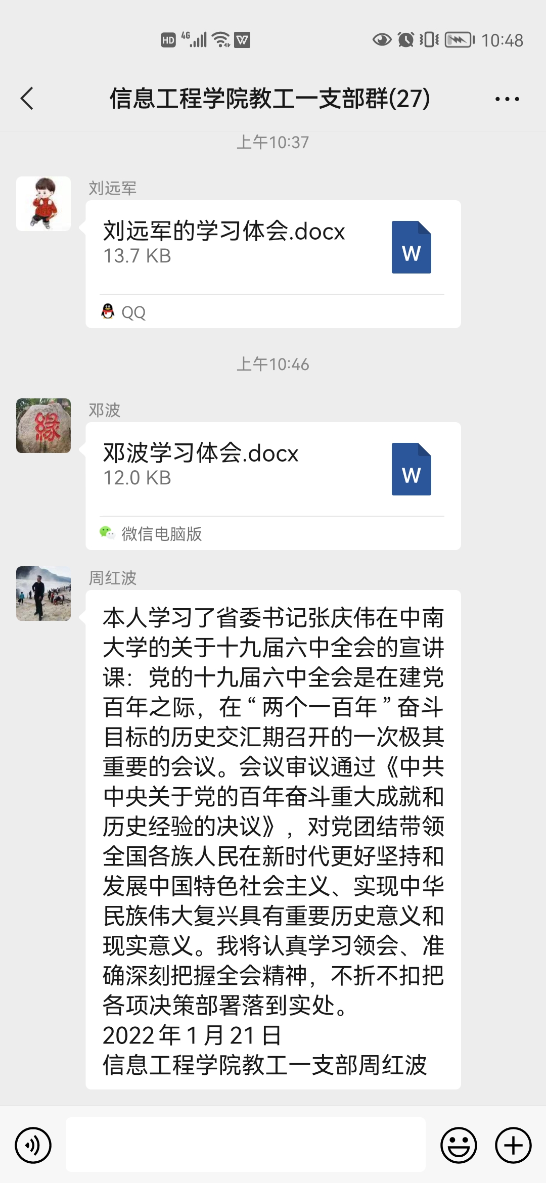 学习交流会以各支部常规微信群、QQ群为平台,首先各支部书记将《张庆伟同志在中南大学宣讲党的十九届六中全会精神的报告》及学院整理的湖南日报、凤凰网等主流媒体的宣传报道发至群中供全体党员学习。各支部学习完张庆伟同志在中南大学宣讲党的十九届六中全会精神的报告后,分别进行了学习体会的交流。