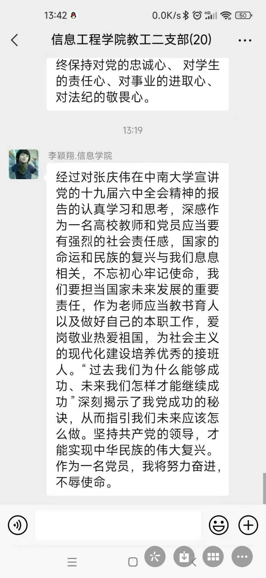 信息工程学院全体党员通过对《张庆伟同志在中南大学宣讲党的十九届六中全会精神的报告》的学习,进一步将十九届六中全会精神与实践相结合,指导实践,同时也将奋斗强国的奋斗能量传递给了学院全体师生。最后,党总支书记彭亦飞对本次线上交流会进行了总结,他表示本次学习更加坚定了我院师生明确使命担当,积极投身社会实践,为我国特色社会主义建设奉献力量。