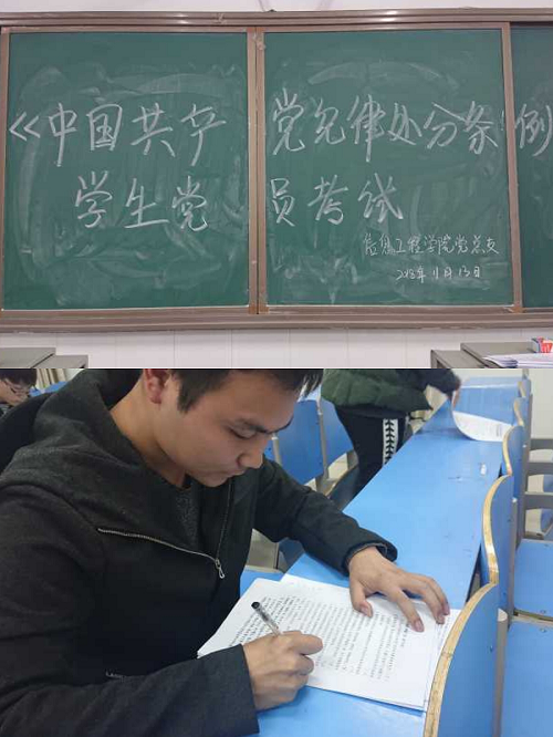 学习中肖老师通过对《中国共产党纪律处分条例》的详细解说,使学生党员们更加清楚地明白坚守纪律、维持良好作风的重要性。会后,为了考核学生党员们对于《中国共产党纪律处分条例》的掌握程度,我院于11月14日晚在明德楼南108教室进行了学生党员《纪律条例》考试。