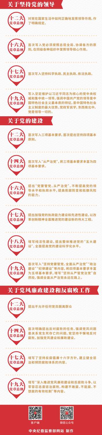 党的十九大审议通过了《中国共产党章程(修正案)》,对党章作了重大修改。字斟句酌的改动背后,凝结着党的十八大以来的丰富实践探索和历史性变革,蕴含着对新时代党的事业发展和党的建设的新要求,昭示着党的前进方向。中央纪委监察部网站即日起推出“党章修改背后的故事”系列文章,解读党章修改背后的历史脉络和深刻内涵,敬请关注。