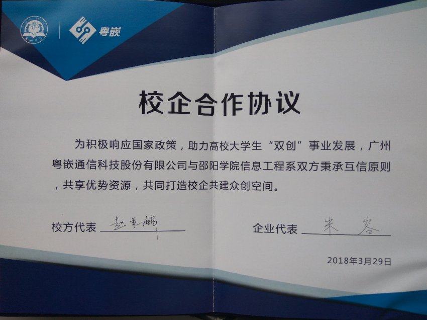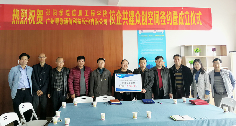 2017年11月邵阳学院信息工程学院跟广州粤嵌通信科技股份有限公司签署了合作框架协议,由广州粤嵌投资40余万元,于2018年3月组建国家级粤嵌众创空间邵阳学院分部,为大学生创新创业提供学习平台。2018年8月邵阳学院粤嵌众创空间经湖南省教育厅批准成为省级大学生创新创业教育基地。实行以“学校主导、企业协同、产学研合作”新型培养管理的模式,由专门老师负责创新创业训练管理与指导,每年粤嵌公司派工程师或创业高级讲师对空间学生开展技术指导和讲座。空间常年有20余名来自学校和企业的指导老师,对信息工程类专业的学生进行创新实践能力的训练和各类学科竞赛的指导。深化创新创业教育人才培养模式改革,将校企合作制定培养方案和企业学习方案、开发优质实践教学资源、双师双能型教师队伍建设、企业专家进课堂等校企合作育人机制落到实处,全面提高专业人才培养质量。