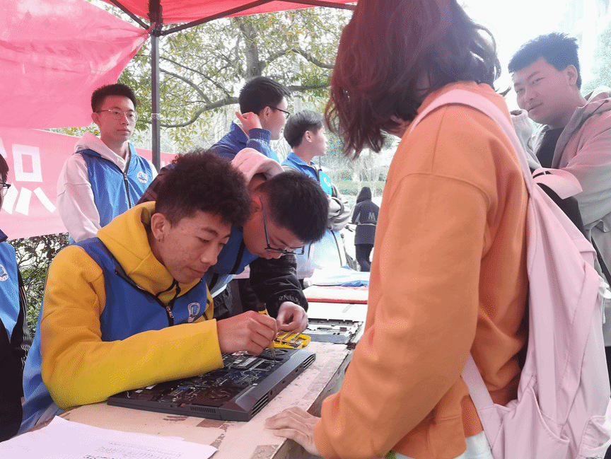 上午10点后,维修点便迎来了络绎不绝的老师与同学, 他们带着自己有问题的电子产品前来维修,有电脑、吹风机、插排等,志愿者们连忙热情地接待他们,耐心询问电器存在的问题后,指引他们填写好自己的信息。在维修过程中,维修部的志愿者对每一件需要维修的物品仔细查询,寻找解决方法,换零件、接电线、整理路线;并为同学们排查电脑出现的故障,努力解决电脑黑屏、卡顿等问题,为同学们完成系统重装,软件安装等工作。活动现场气氛融洽,志愿者忙的不亦乐乎,他们在各自的战场上挥洒着热情、倾注着努力,凭借着在课堂和协会学到的扎实专业维修知识和良好的服务态度,赢得了广大师生的一致好评。