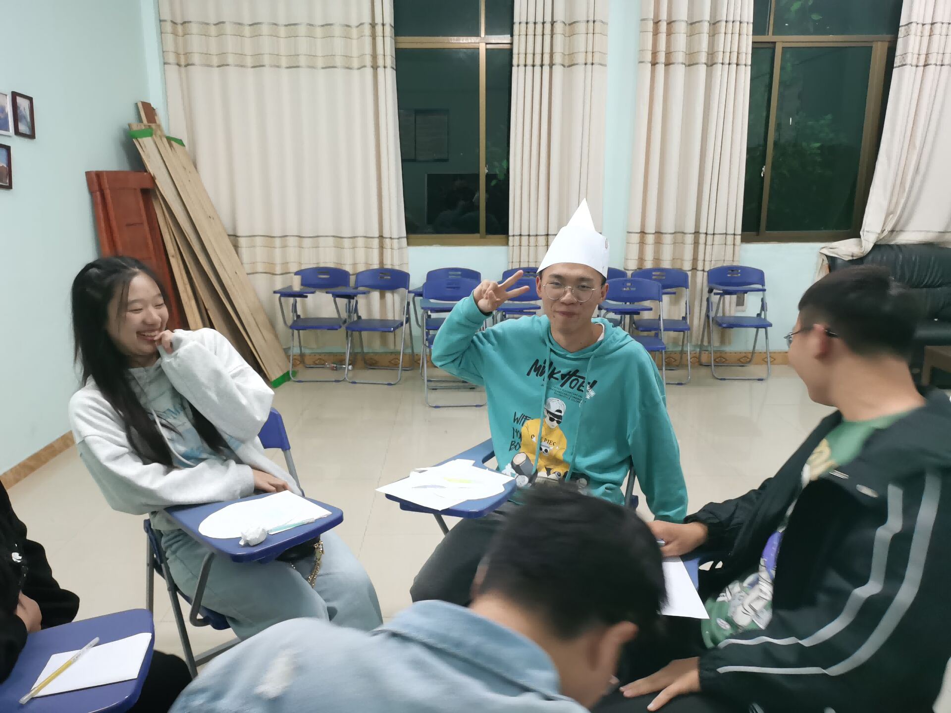 活动的高潮来到了“ 戴高帽”小游戏,各成员用剩余A4纸做成小礼帽,小组成员依次佩戴,然后各成员表达对戴帽者发自内心的赞美与祝福。这个游戏帮助大家树立自信心,获得生活和前进的力量。