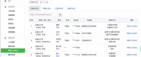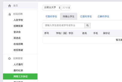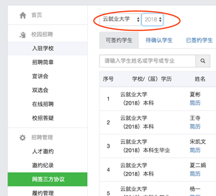 在用人单位管理后台,点击左侧菜单栏“招聘管理”=》“网签三方协议”进入签约管理页面。注意切换入驻的学校和毕业年份。