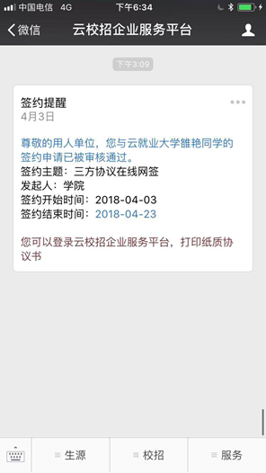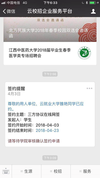单位对学生发起邀约后,如学生应约,则当前HR微信会收到学生应约通知: