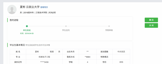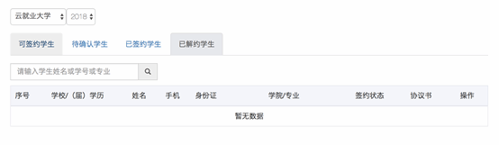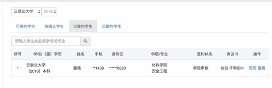 点击“已签约学生”,可以查看已经签约的同学列表,和当前协议书的审核状态;