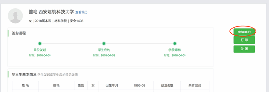 当用人单位与已签约学生达成解约共识,学生可以进行“申请解约”操作,用人单位也可以进行“申请解决”操作(前提是学校参数开放了允许单位发起解约)。用人单位发起申请解约操作如下: