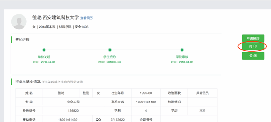点击左侧菜单栏“网签三方协议”=>“已签约学生”,进已签约学生列表页面,点击“查看”按钮,然后点击右边,打印按钮,即可打印三方协议;
