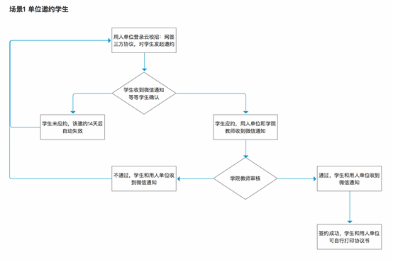 签约管理主要有5大功能:(1)查看各种状态的学生(可签约、待确认、已签约、已解约);(2)发起邀约;(3)修改邀约信息;(4)微信消息通知;(5)打印协议书;(6)发起解约申请(具体需要学校是否开放单位解约申请通道)。