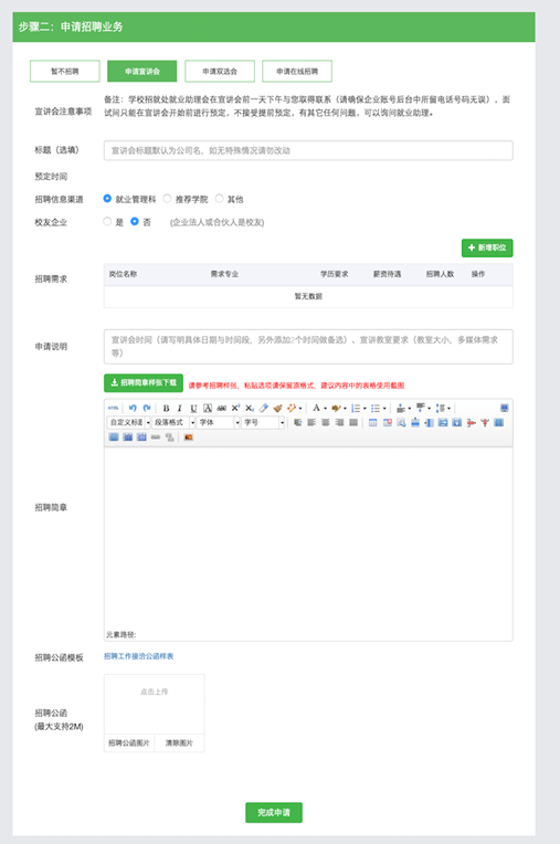 第二步:“步骤二:申请招聘业务”,根据招聘选择类型,并填写相关申请资料,最后点击“完成申请”即可