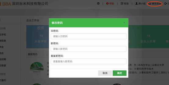 登录成功后,在左侧菜单栏点击“首页”,即可进入用人单位工作台。可以查看当前一些数据概览、最新简历、系统消息。在系统界面右上角可以操作:修改密码。